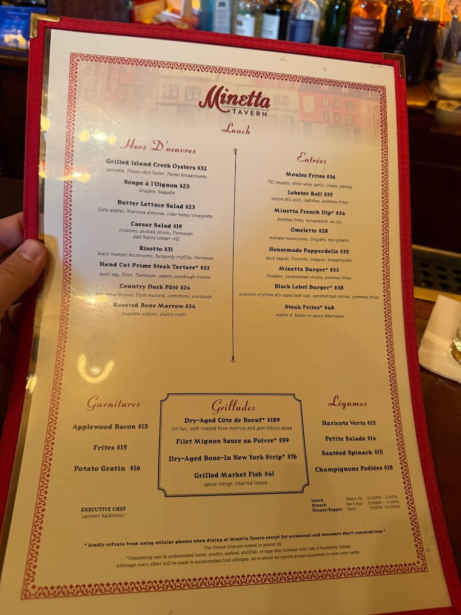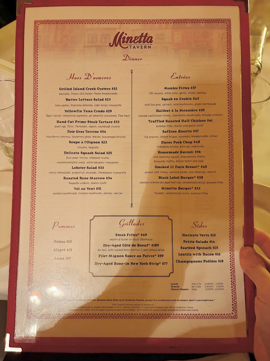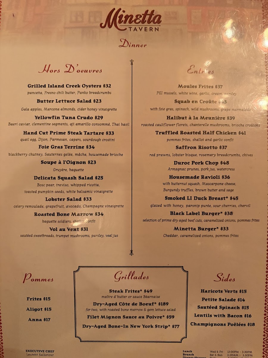 Minetta Tavern’s menu is a masterful blend of classic French bistro fare and hearty New York tavern favorites, delivering rich flavors in every dish. Start with their Moules Frites—plump Bouchot mussels bathed in a delicate sauce Poulette, paired perfectly with crisp pommes frites. The Arctic Char offers a refined balance of sautéed corn, earthy chanterelle mushrooms, and light corn foam, showcasing thoughtful seasonal ingredients.